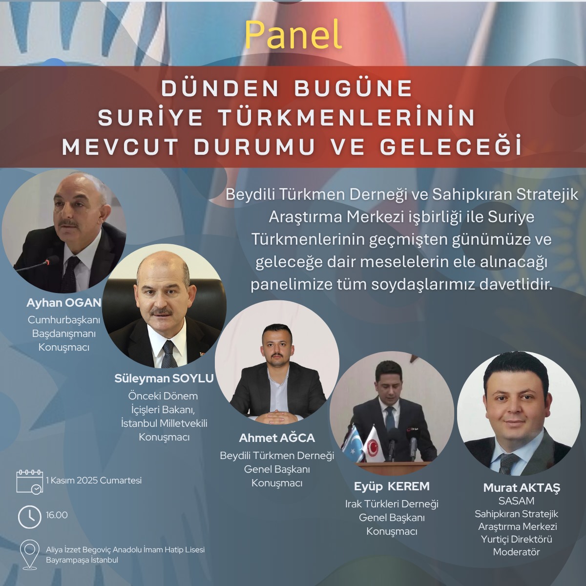 Sahipkıran Stratejik Araştırma Merkezi Marmara Bölge Koordinatörlüğü ve Beydili Türkmen Derneği işbirliğiyle İstanbul’da “Dünden Bugüne Suriye Türkmenlerinin Mevcut Durumu ve Geleceği” paneli düzenleniyor.